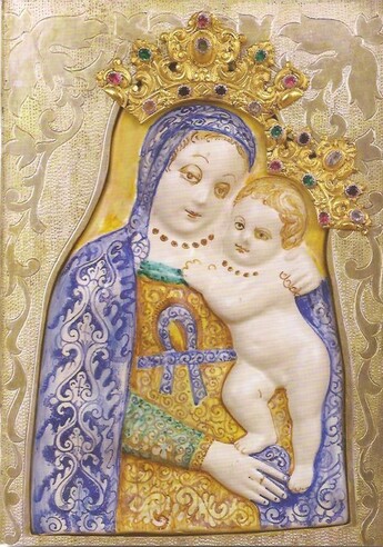 Nella celletta Biondelli era venerata un'immagine mariana in ceramica di Faenza, acquistata dalla Confraternita della SS. Annunziata di Solarolo nel 1683 e donata all'arciprete don Nicola Baldassarri che la collocò nella sua chiesa. Per promuovere la devozione alla Madonna nei fanciulli che frequentavano la dottrina cristiana, l'arciprete fece portare processionalmente l'immagine dai fanciulli stessi nella celletta del Rio, o dei Biondelli dal nome dei proprietari del luogo, e vi si recava coi fanciulli nei giorni festivi per cantare le litanie lauretane e recitare altre preghiere. Ma, con la morte dell'arciprete Baldassarri, la pratica cessò e la celletta rimase presto dimenticata e in preda alle erbacce che le crescevano intorno. L'immagine, ora venerata col titolo di Madonna della Salute, è di un tipo molto comune nella Romagna. Se ne conoscono molte riproduzioni, foggiate nelle botteghe di Faenza e Imola, un tempo sparse sulle case, sugli alberi e nei pilastrini, e oggi purtroppo nella maggior parte scomparse. La devozione dei fedeli ad alcune di queste immagini hanno dato origine, come qui a Solarolo, ai santuari del Monticino, a Brisighella; di Sulo, vicino a Forlì; delle Grazie, a Tredozio; ed altri ancora. La Santa Vergine vi è rappresentata avvolta da un manto celeste che le copre il capo e con una veste gialla stretta alla vita da un nastro azzurro. Stringe a sé col braccio sinistro il Bambino ignudo che, abbracciandola, accosta il suo viso a quello della Madre.
