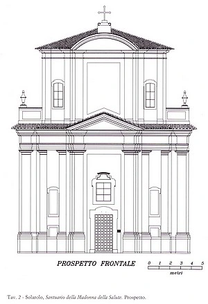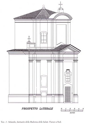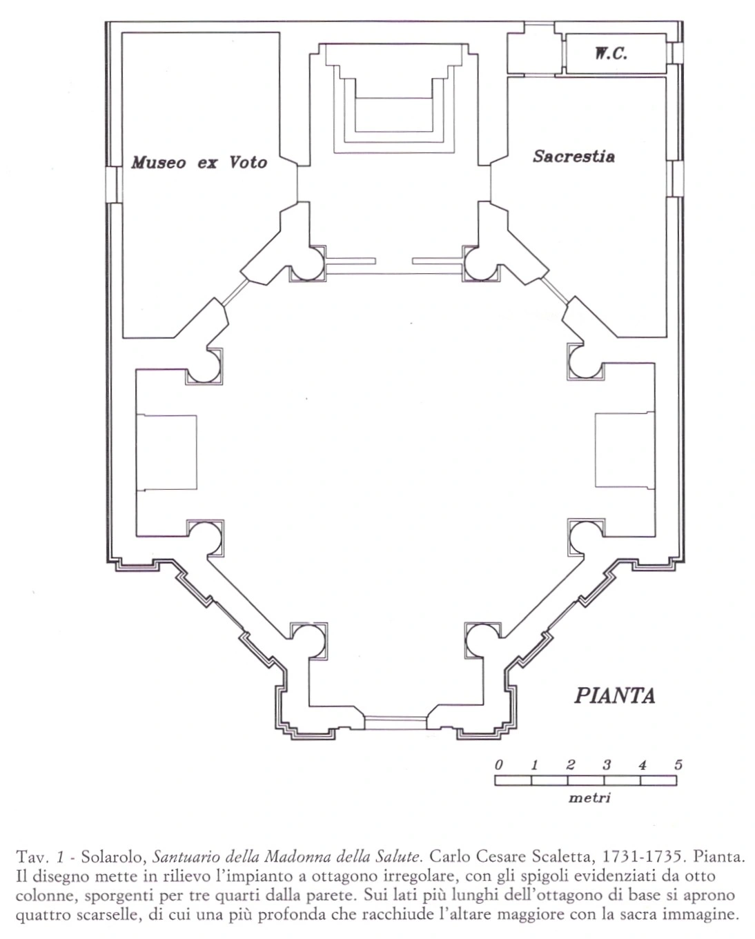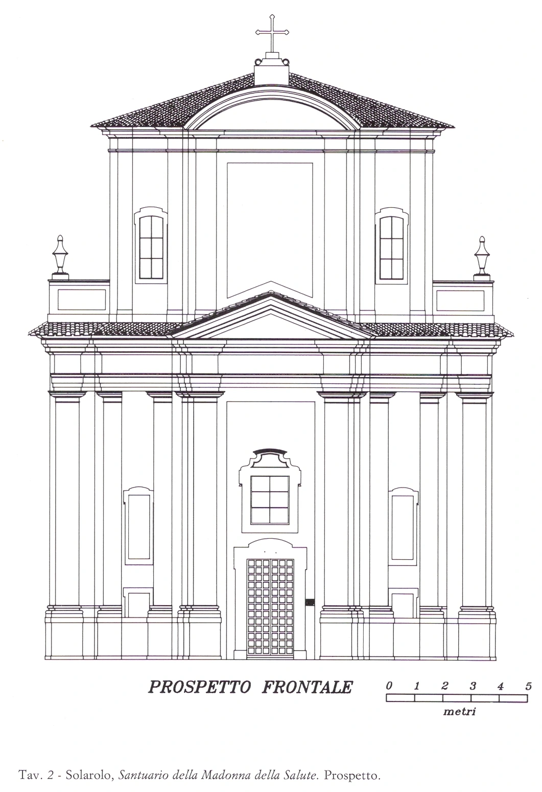 Sotto la direzione e con l'assistenza degli insegnanti di Topografia, prof. Salvatore Leonardi e prof. Gian Tomaso Vassura, nell'anno scolastico 1991/1992, si è presentata, per le classi quarte dell'I.T.C.G. "A. Oriani" di Faenza, l'occasione di effettuare, sotto forma di esercitazione, il rilievo architettonico del Santuario della Madonna della Salute. La prima fase, quella di "presa fotogrammetrica" e del rilievo planimetrico dell'interno, è stata realizzata nel mese di Ottobre 1991. Dopo la preventiva segnalizzazione di vari punti della facciata (con apposizione di "scopi" costruiti e affissi su tre livelli di quota), un gruppo di studenti ha eseguito le "prese fotogrammetriche" mediante fotocamera metrica Zeiss TMK6; in contemporanea un altro gruppo di studenti ha provveduto al rilievo dei punti significativi di facciata mediante strumentazione topografica classica (teodolite e distanzio metro elettro-ottico). È stata eseguita la fase di elaborazione dei dati e restituzione fotogrammetrica ai computer, mediante i programmi MR2 Rollei e Autocad, fase che è stata sviluppata nel periodo dal novembre del 1991 al marzo del 1992. I risultati del lavoro sono presentati nelle tav. n. 1,2 e 3.