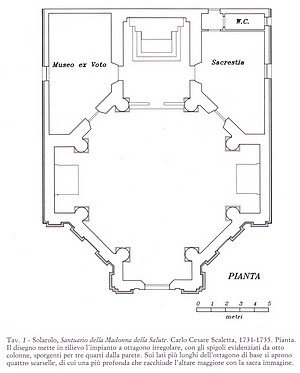 Dalla tav. n. 1 (pianta) si possono desumere le seguenti caratteristiche salienti e corrispondenti misure di massima: pianta a croce sovrapposta concentricamente ad ottagono; larghezza (braccio minore) compresa tra 14,30 m. e 15,60 m.; profondità (braccio interno) dell'ottagono tra 18,25 m. e 19,50 m.; lato medio interno dell'ottagono 11,50 m.; spessore muri esterni compreso tra 0,65 m. e 0,80 m.Dalle tavole n.2 e 3 (prospetti frontale e laterale) si desume: parte inferiore ottagonale con altezza massima del timpano pari a 13 m. e larghezza 15,70 m.; corpo superiore ottagonale con altezza del centro della croce pari a m.22,20 e larghezza di m.11,50.